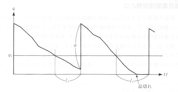 販売店の在庫 q は、図10.2.1のように毎日の売上げ k 個ずつ減少していきます。基準発注点 q1 をわったら、 a 個の発注をしますが、すぐには入荷せず、 lt 日の遅れがあります。図10.2.2のように、在庫量は変化するでしょう。売上げ個数と入荷おくれが確率的である場合を考え、