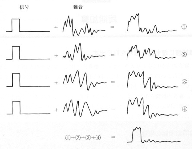 雑音の方が信号より大きいという悪条件の中で、信号を取り出すにはどうしたらいいのでしょうか。もしも同じ信号が、くり返し発せられるということが、わかっていれば、図7.4.1のように波形を加算し、平均することにより、雑音の影響を少なくすることができます。ただし信号を時系列上で同じ位置に固定して加算しなけれはいけません。これを信号と同期をとるといい、同期加算をよばれるゆえんです。アンサンブル平均ともいいます。